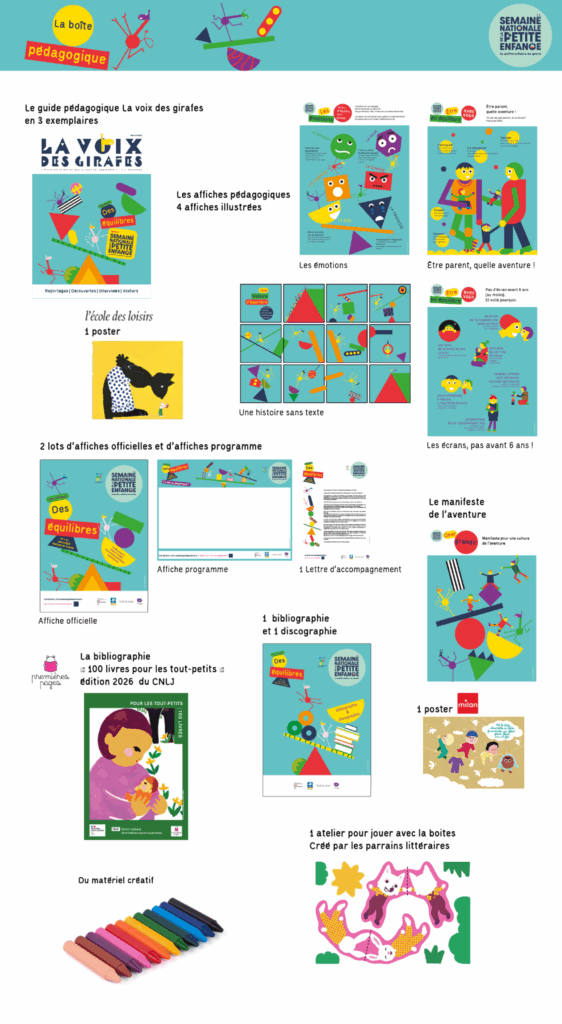 - 4 Planches pédagogiques : Être en équilibre avec vous, la co-éducation en question, Les écrans, Les émotions, un jeu d’équilibre pour grandir – par Agir pour la petite enfance,
