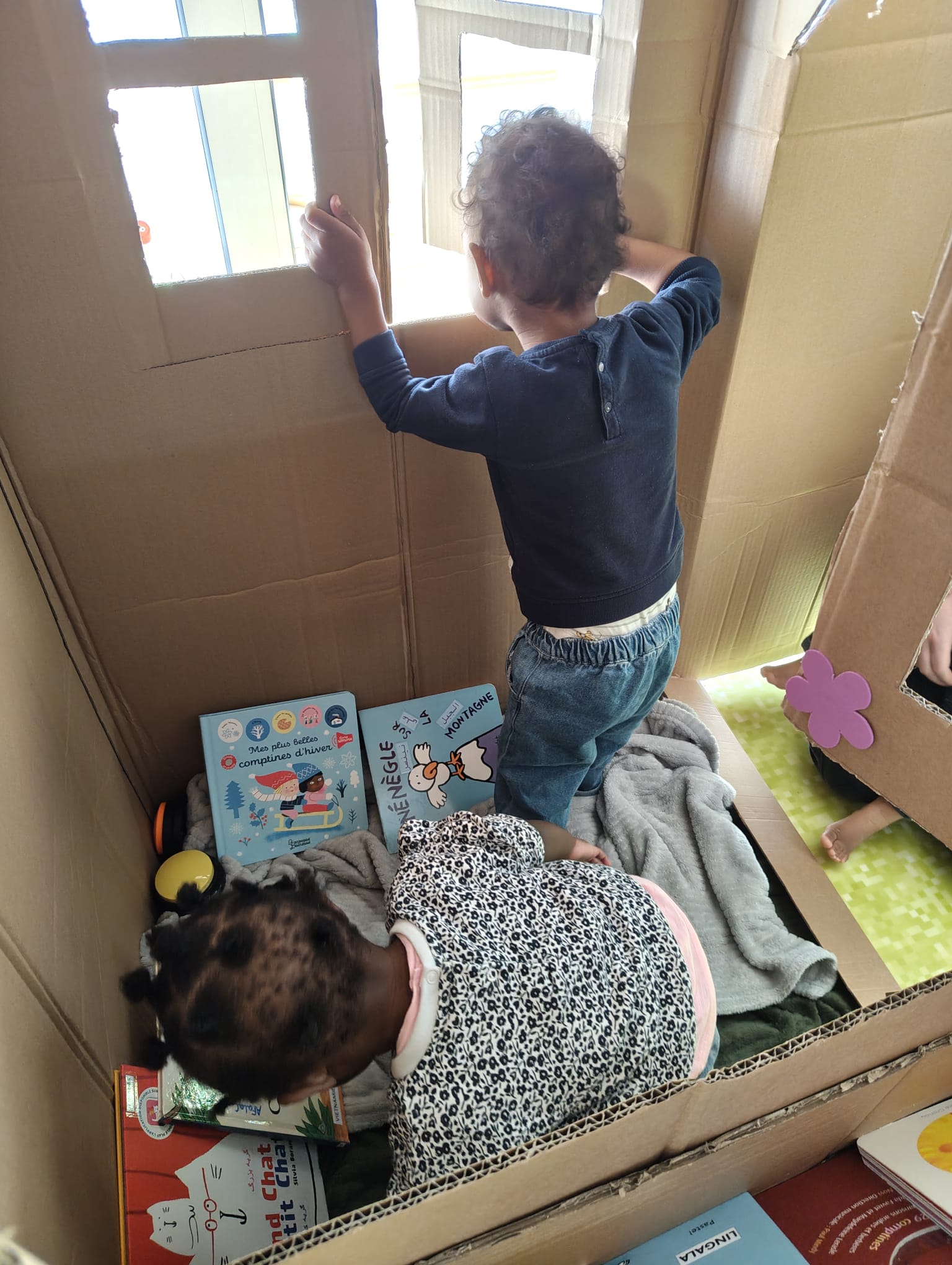 Dans la crèche, nous avons installé une maison en carton, réalisée avec des matériaux de récupération. Les enfants ont tout de suite eu envie d’y entrer. À l’intérieur, ils découvraient des albums 0–3 ans en français et dans les langues des familles, ainsi que des buzzers où étaient enregistrés des mots de parents pour rassurer leur enfant, et de courts extraits de berceuses en langue familiale.