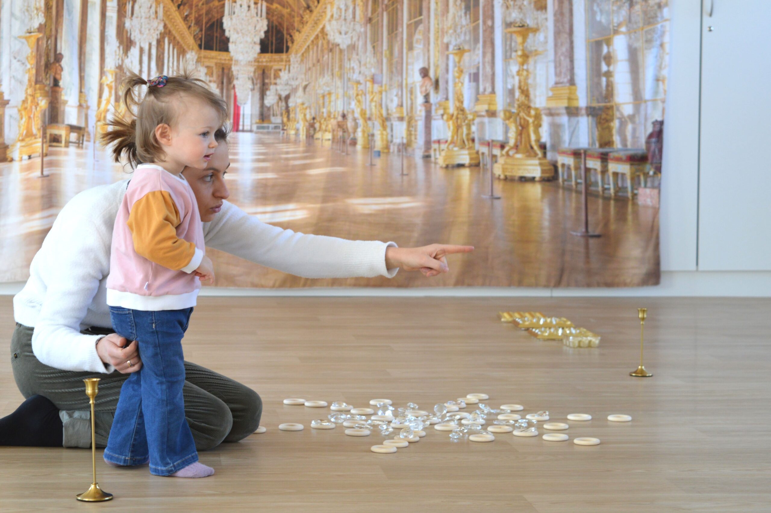 De part et d’autre de la pièce, comme pour dessiner un couloir, sont disposés les miroirs, les anneaux de bois, les chandeliers et les compartiments dorés. L’ensemble est organisé de manière parfaitement symétrique.